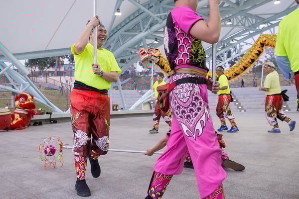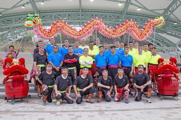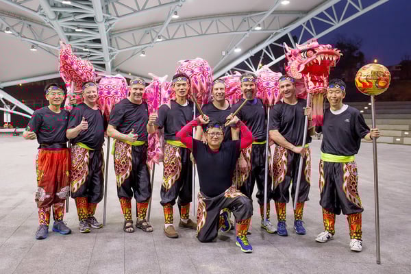 After further briefing, participants breakout into teams of approximately 9-12 members per dragon to learn the 8 basic movements of the dragon and drumming techniques from a professional dragon dancing instructor & facilitator.